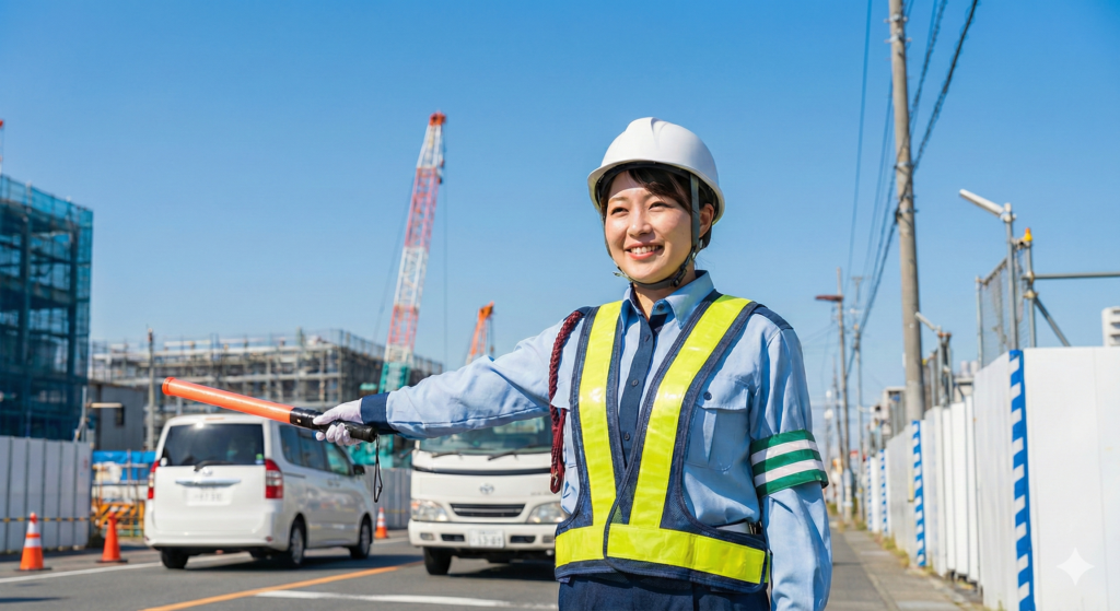 現場の信頼を左右するのは、一瞬の判断とキビキビとした動作。通行車両を迷わせない、視認性の高いスマートな誘導を徹底します。